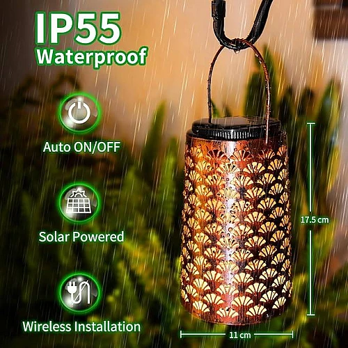 • 🌦️ تصميم مقاوم للعوامل الجوية: مصنوع من معدن متين (أو بلاستيك عالي الجودة بلمسة نحاسية)، ومقاوم للماء والغبار (IP55)، مما يجعله مثالياً للاستخدام الخارجي على مدار العام.