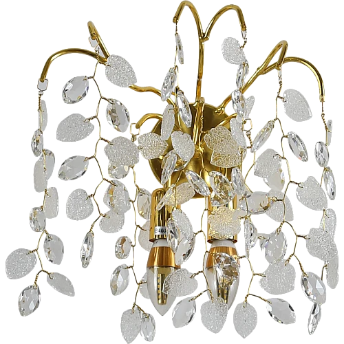 أبليك جداري مودرن بتصميم فاخر يجمع بين التشطيب الذهبي الأنيق والكريستال الشفاف ليمنح المكان لمسة فخامة ولمعان راقٍ، مع إمكانية اختيار نوع ولمبات الإضاءة حسب ذوقك.