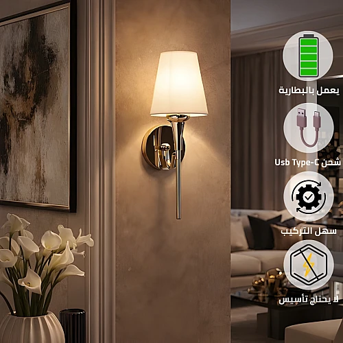 - تركيب سهل وفوري: لا حاجة للحفر أو الأسلاك المخفية. يعمل بالبطارية المدمجة، مما يتيح لك تركيبه بسهولة وسرعة في أي مكان: المداخل الفاخرة، غرف النوم الرئيسية، الصالات، أو لإبراز اللوحات الفنية بلمسة ذهبية.