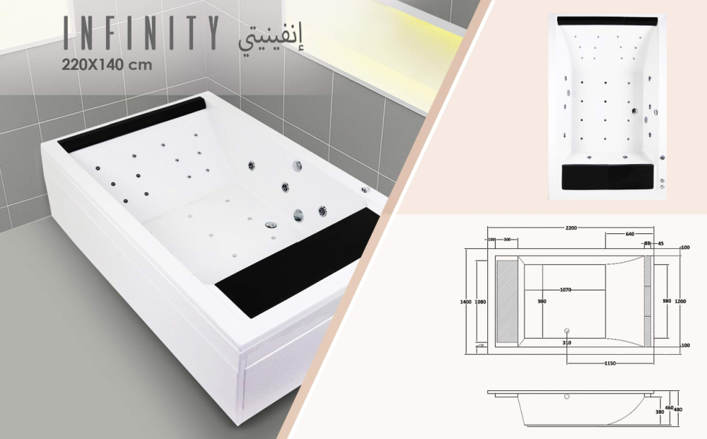جاكوزي إنفينيتي فل كامل مقاس 220*140 صناعه بحريني اجهزه اوربيه النمسا بضمان عسر سنوات على بنل خارجي وسنتين على جميع قطع