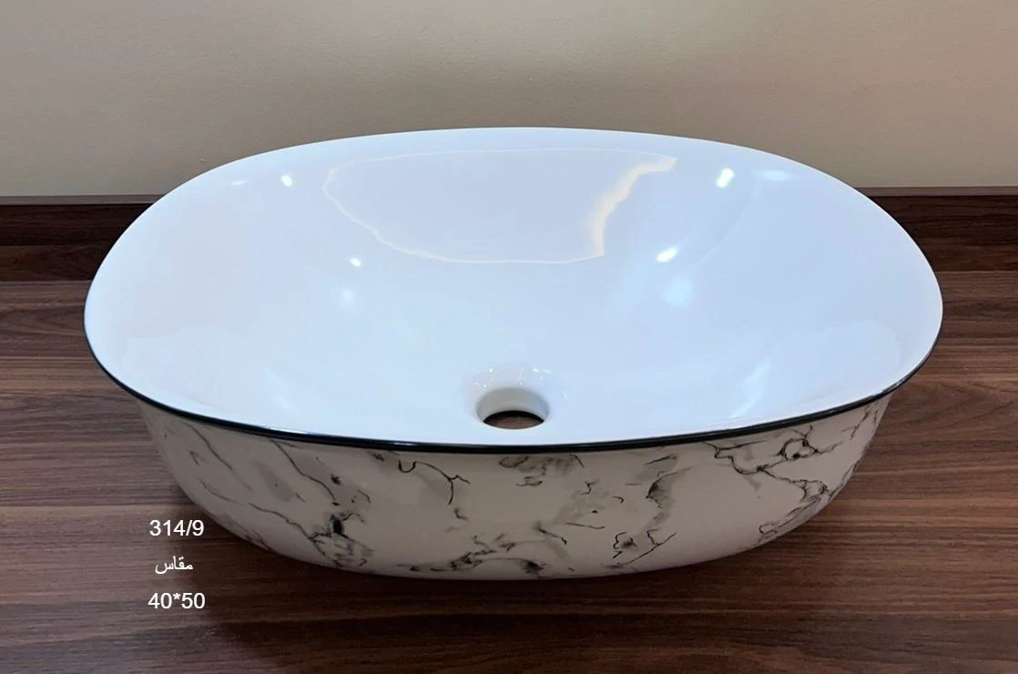 حوض بيضاوى ابيض مزخرف فوق الرخام