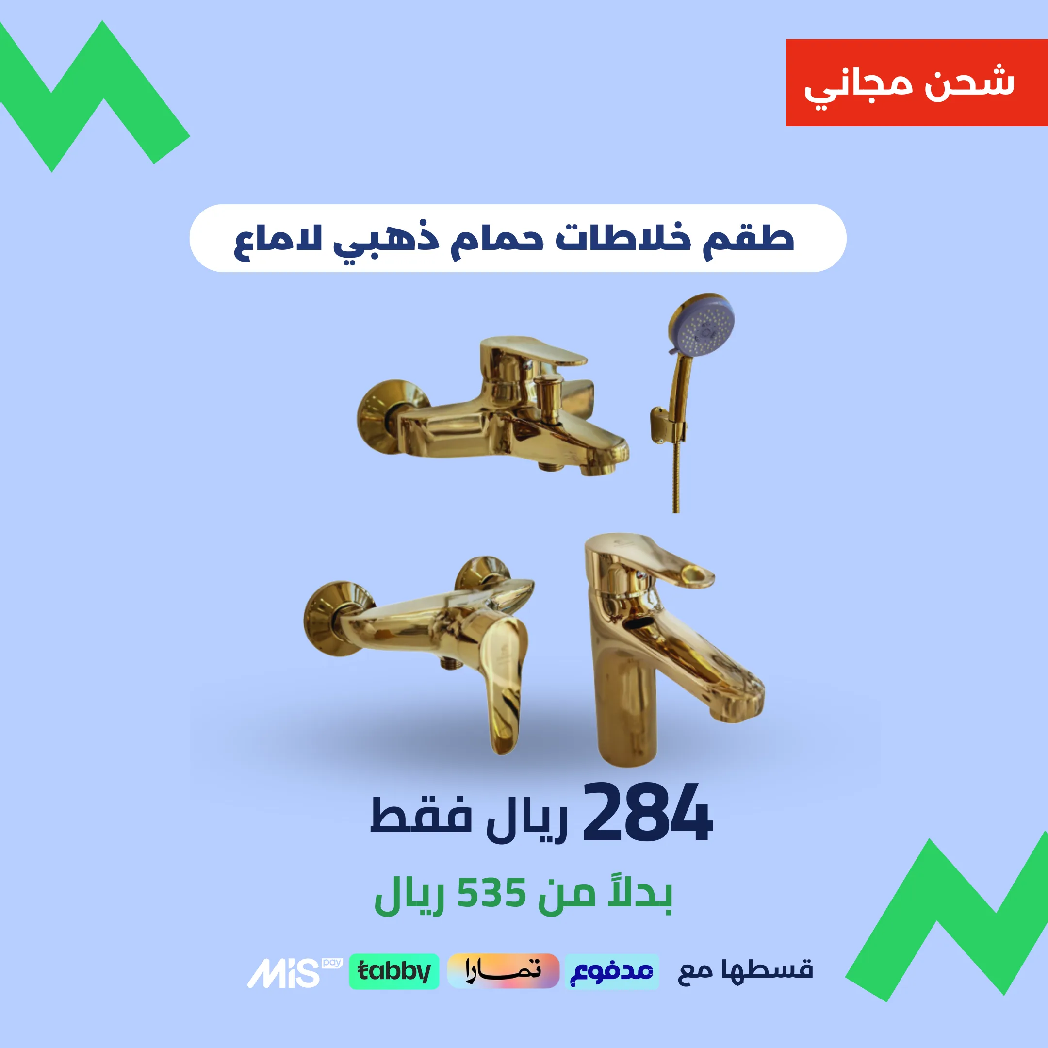 طقم خلاطات بتشطيب ذهبي لامع أنيق يناسب الحمامات العصرية والفخمة.