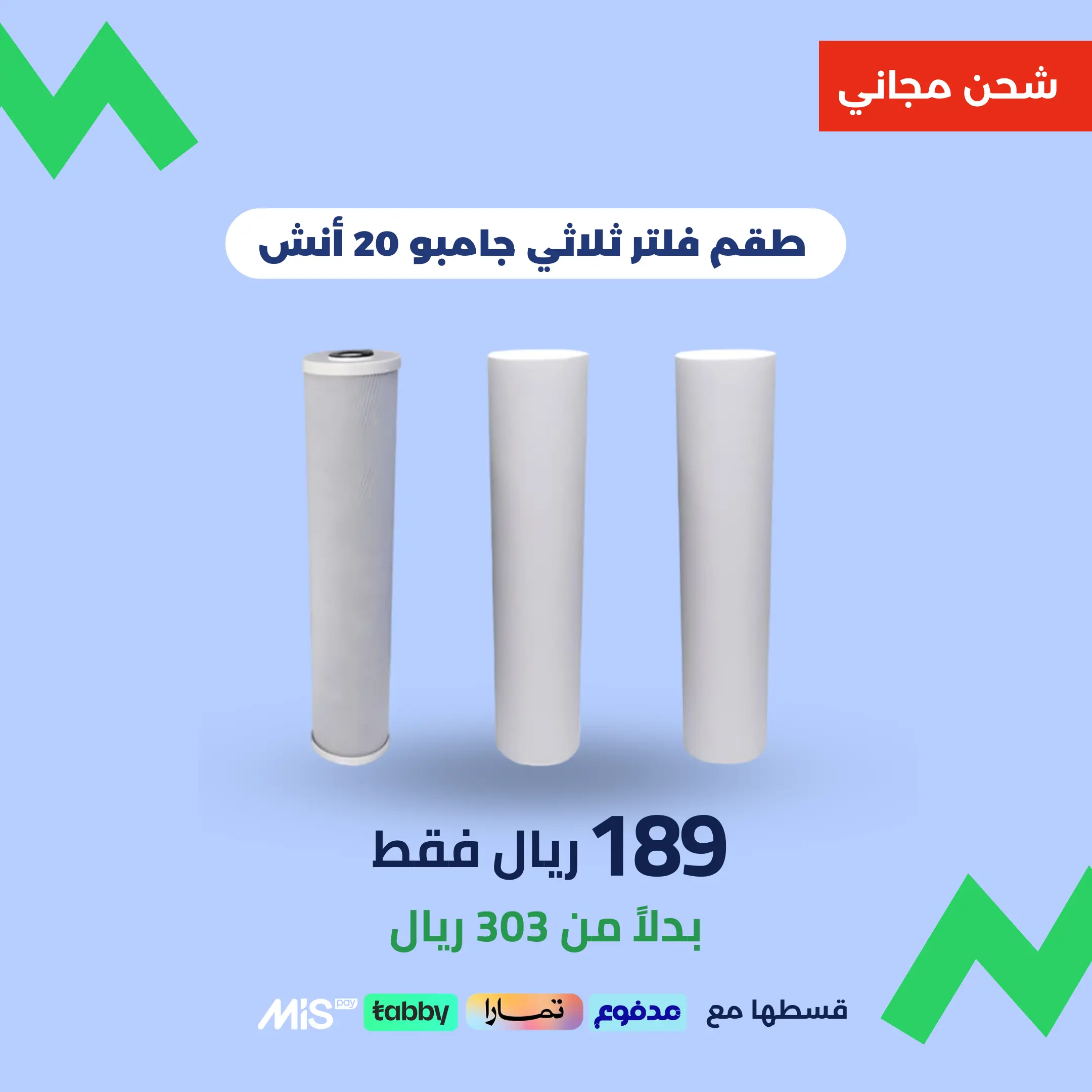 طقم فلتر جامبو كامل مخصص لفلاتر المياه التي تُركّب على سطح المنزل أو عند خط التغذية الرئيسي.