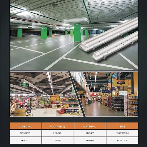 ارتقِ بجودة الإضاءة في المساحات الداخلية والخارجية مع حامل أنابيب LED موديل TF-931، المصمم خصيصًا ليمنحك حماية ثلاثية من الماء، الغبار، والحشرات، مع هيكل متين وسهل التركيب. مثالي للمصانع، المستودعات، مواقف السيارات، والممرات.