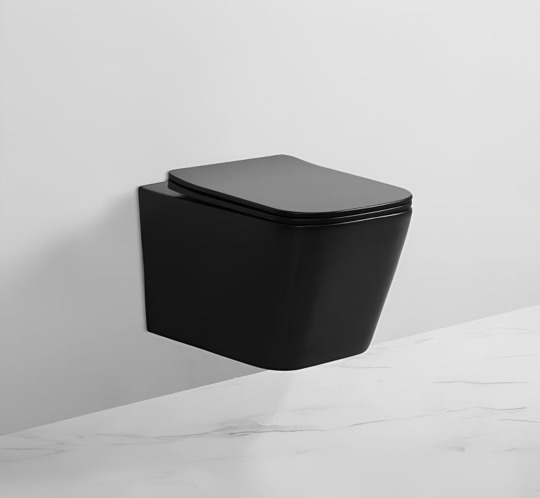 كرسي حمام معلّق بتصميم مودرن مربع يمنح الحمام مظهراً عصرياً وأنيقاً، مع لون أسود مطفي فاخر يضيف لمسة فخامة واضحة.