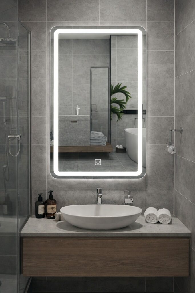 مرآة بإطار ستانلس ستيل أسود بتصميم عصري فاخر تضيف لمسة من الأناقة والتميز للمكان، مع مقاس عملي 60×80 سم يوفر رؤية واضحة ومريحة. إطار متين مقاوم للرطوبة والصدأ يجعلها مثالية للاستخدام اليومي في الحمّامات أو غرف الملابس، مع لمسة تصميمية عصرية تتناسب مع الديكورات الحديثة.