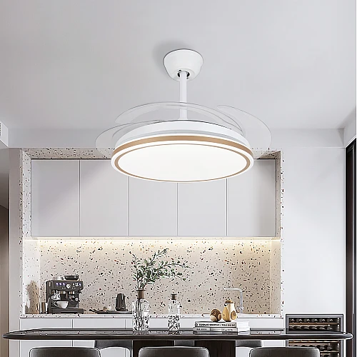 - تصميم “الشفرات المخفية” الثوري: عندما لا تكون المروحة قيد التشغيل، تختفي الشفرات الشفافة داخل الهيكل المعدني الأنيق، مما يحافظ على جمالية الثريا العصرية ويمنحك مظهراً نظيفاً وخالياً من الفوضى البصرية.