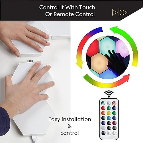 يمكنك التحكم في إضاءة الليد سداسية الشكل من خلال ريموت تحكم او باللمس على الغطاء ، حيث يمكنك تغيير الألوان، وضبط السطوع، واختيار من بين مجموعة متنوعة من المشاهد والأنماط الموسيقية، كل ذلك بسهولة وراحة.