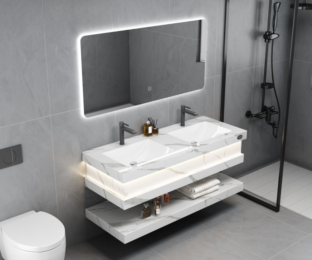 مغسلة رخام ابيض مودرن حوضين ليزر رف مضيئ – 140 سم