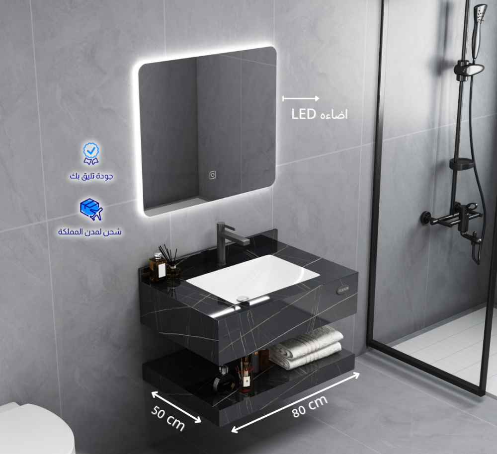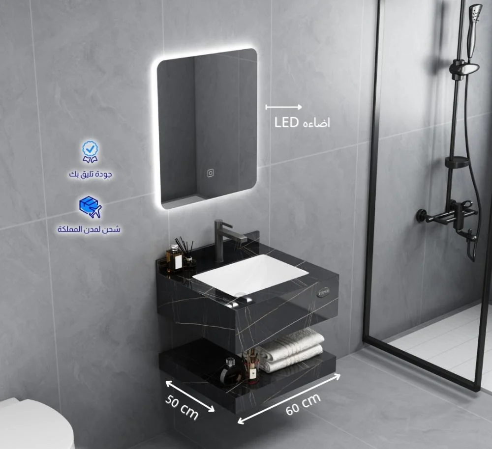 مغسلة رخام صناعي اسود لامع مع مرايا ليد – مقاسات متعددة