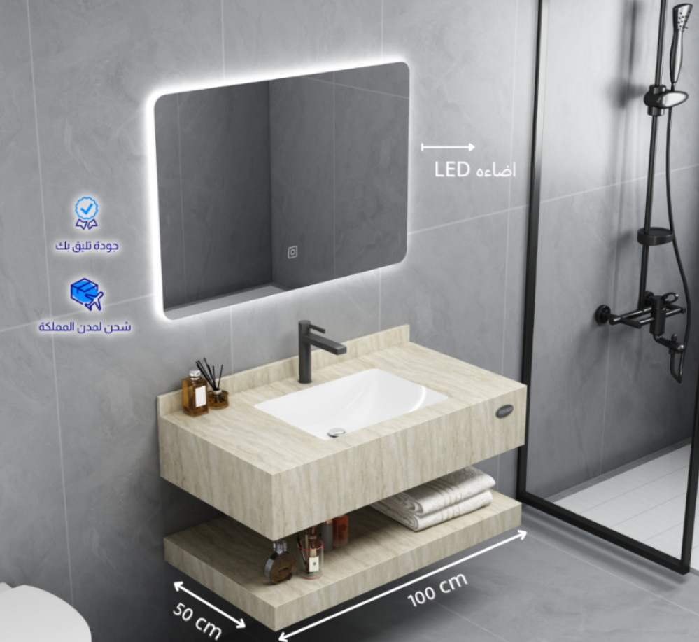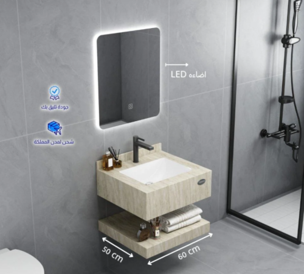 مغسلة رخام صناعي ليزر بيج فاتح مع مرايا ليد – مقاسات متعددة