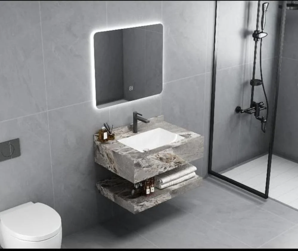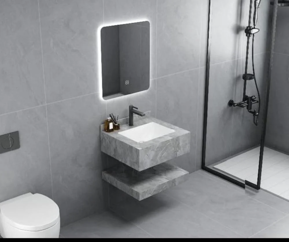 مغسلة رخام صناعي ليزر رمادي (فاتح+ غامق) مع مرايا ليد – مقاسات متعددة