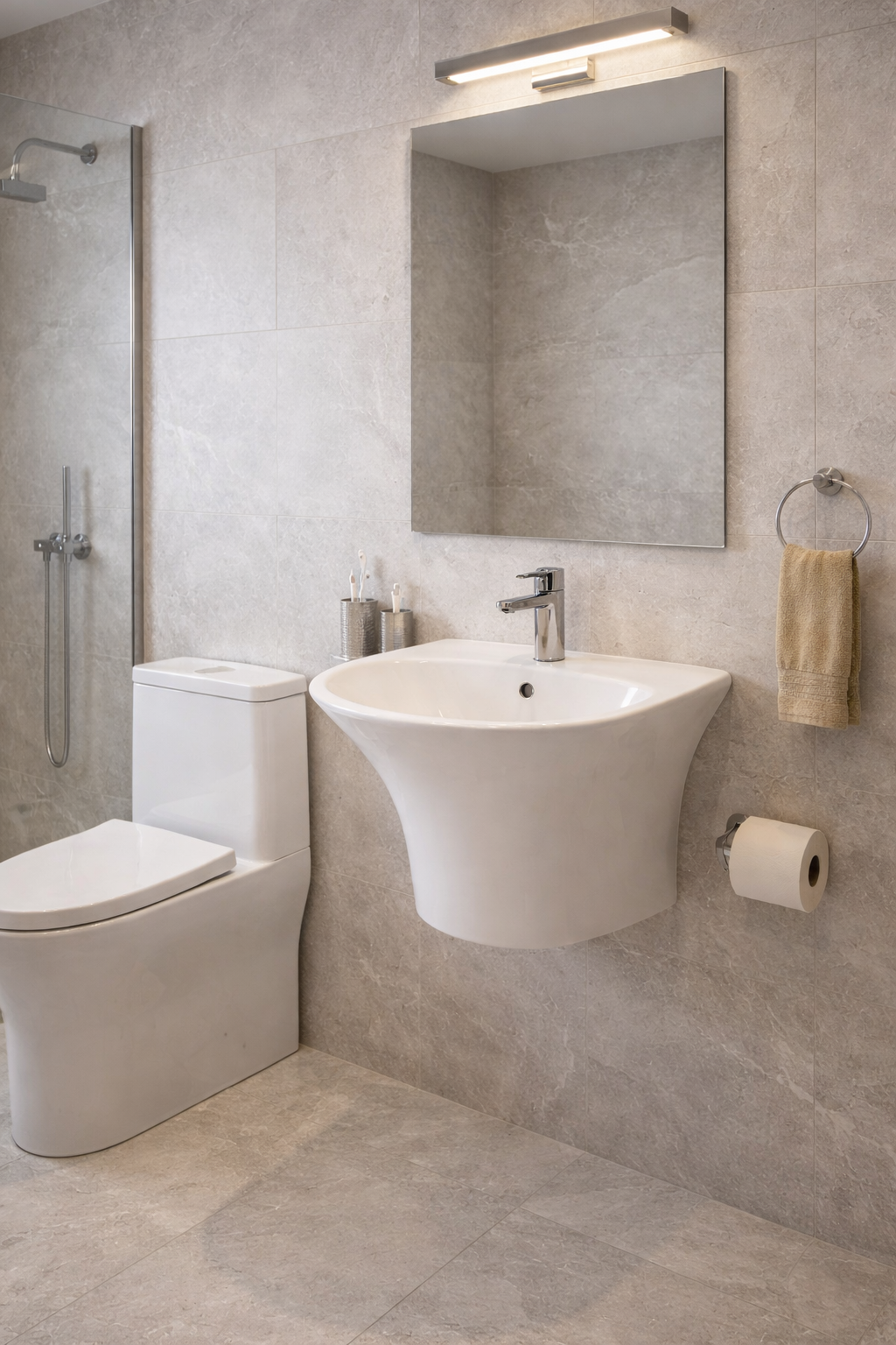 مغسلة معلّقة بتصميم عصري فاخر تجمع بين الأناقة والعملية، صُممت لتناسب الحمّامات الواسعة وتمنحها مظهرًا راقيًا ومنظّمًا. تتميز بمساحة استخدام كبيرة توفّر راحة أعلى، مع تصميم معلّق يساعد على سهولة التنظيف ويحافظ على نظافة الأرضية. كما يضفي شكلها الانسيابي إحساسًا بالاتساع ويمنح الحمام لمسة فندقية أنيقة، مع خامات عالية الجودة تضمن المتانة وطول العمر. خيار مثالي لمن يبحث عن الفخامة، الراحة، والكفاءة في آن واحد.