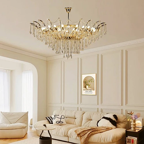 ثريا كلاسيكية تمنح المكان بريقًا خفيفًا ينعكس على كل زاوية